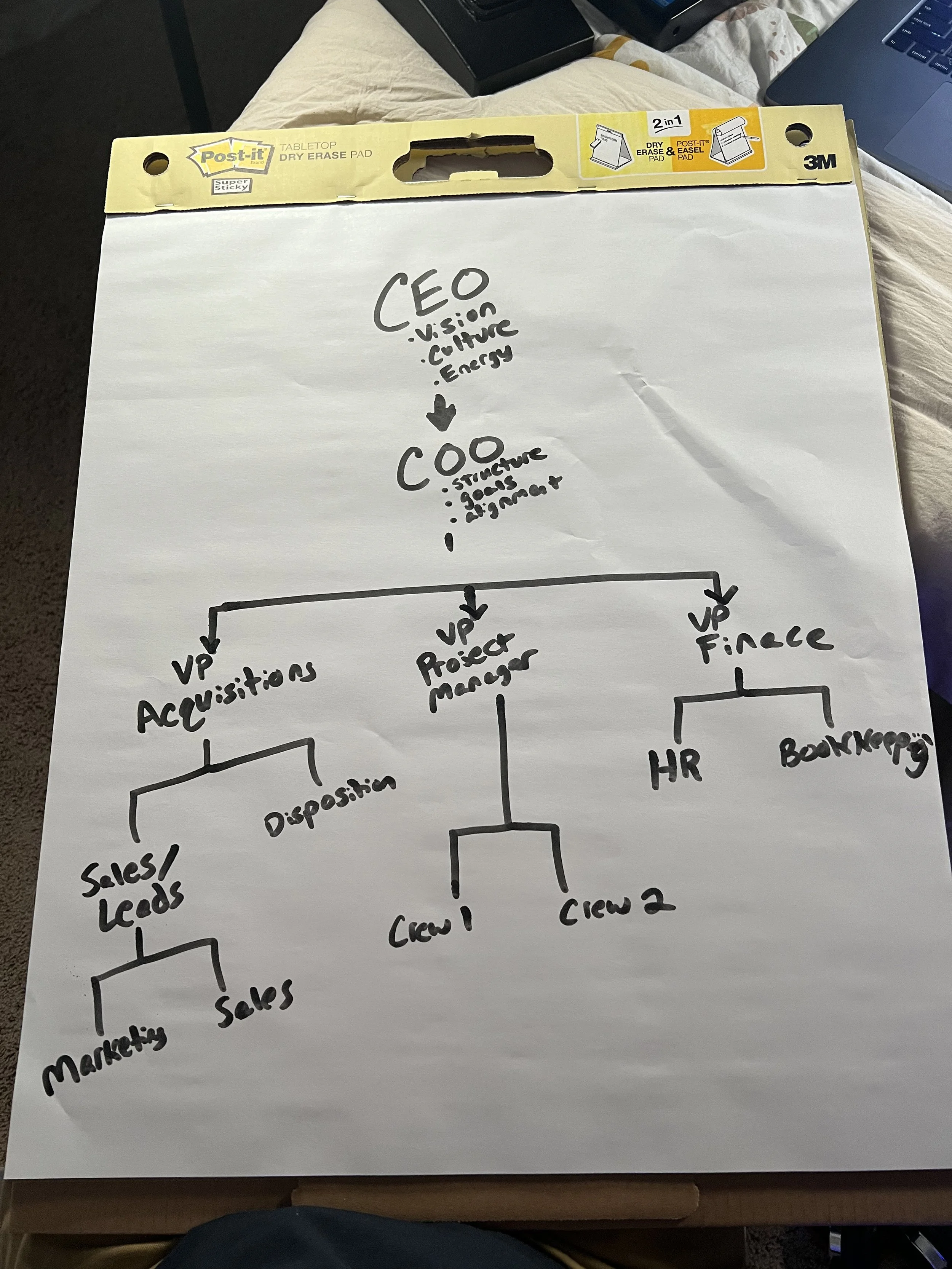 Let’s talk about an organizational chart. I believe an organizational chart is something every single real estate investor and entrepreneur should have, even if you are the only person in your company. What an org chart does is show your company structure as a whole from the CEO down to the grunt workers and the divisions that they all work within.