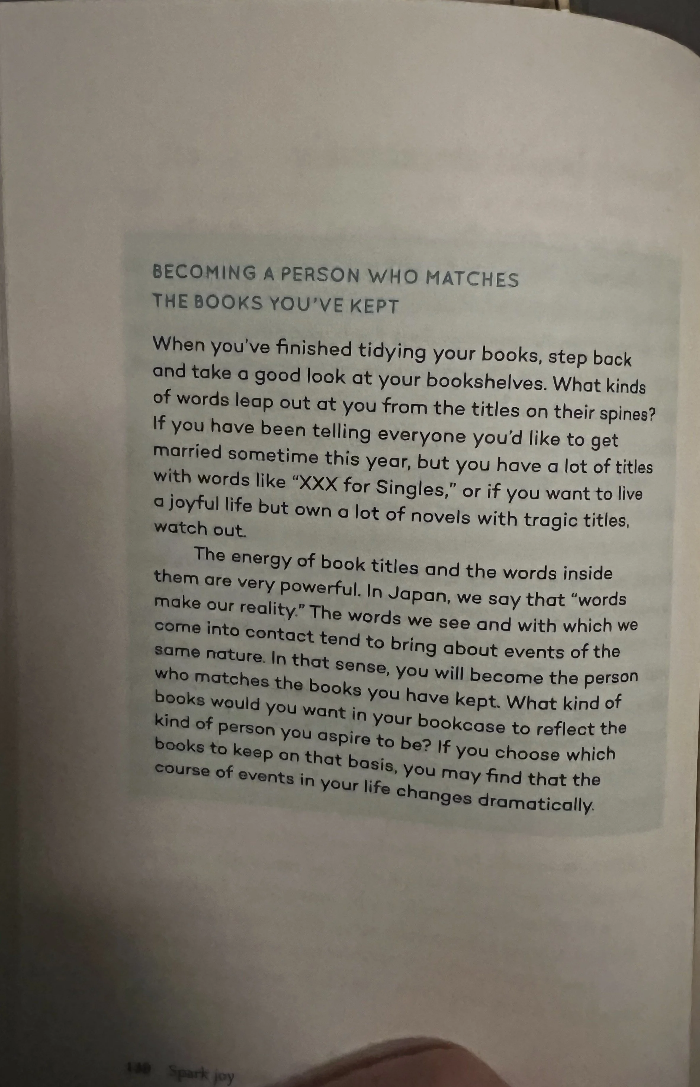 Reading Spark Joy by Marie Kondo. Great book on implementing the whole “Marie Kondo” method of cleaning and organizing. Really great book. Below is a particularly good passage from it: